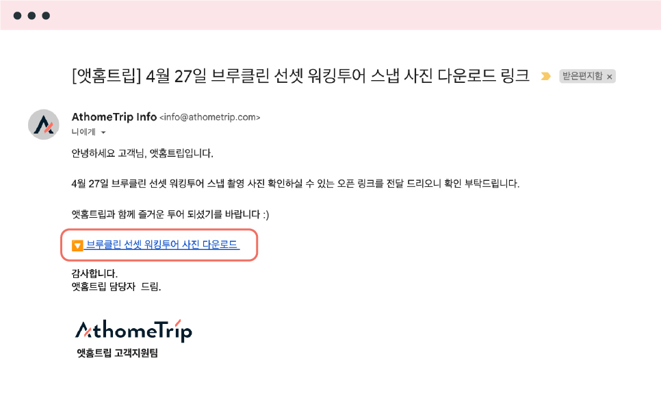 투어 종료 후 14일 이내, 이메일로 전송되는 사진 다운로드 링크를 클릭해 주세요.